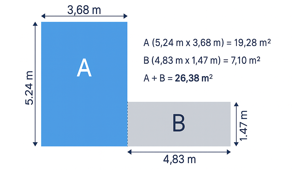 Once you’ve calculated the square metres for each rectangle, add those square metre amounts together to give you the total size of the patio in square metres (m²). See diagram below.